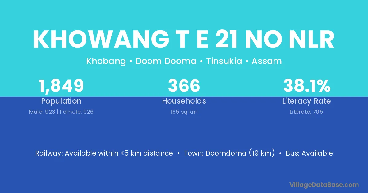 Doomdoma (19 km) is the nearest town to Khowang T E 21 No Nlr village for major economic activities and is located approximately 19 km away.