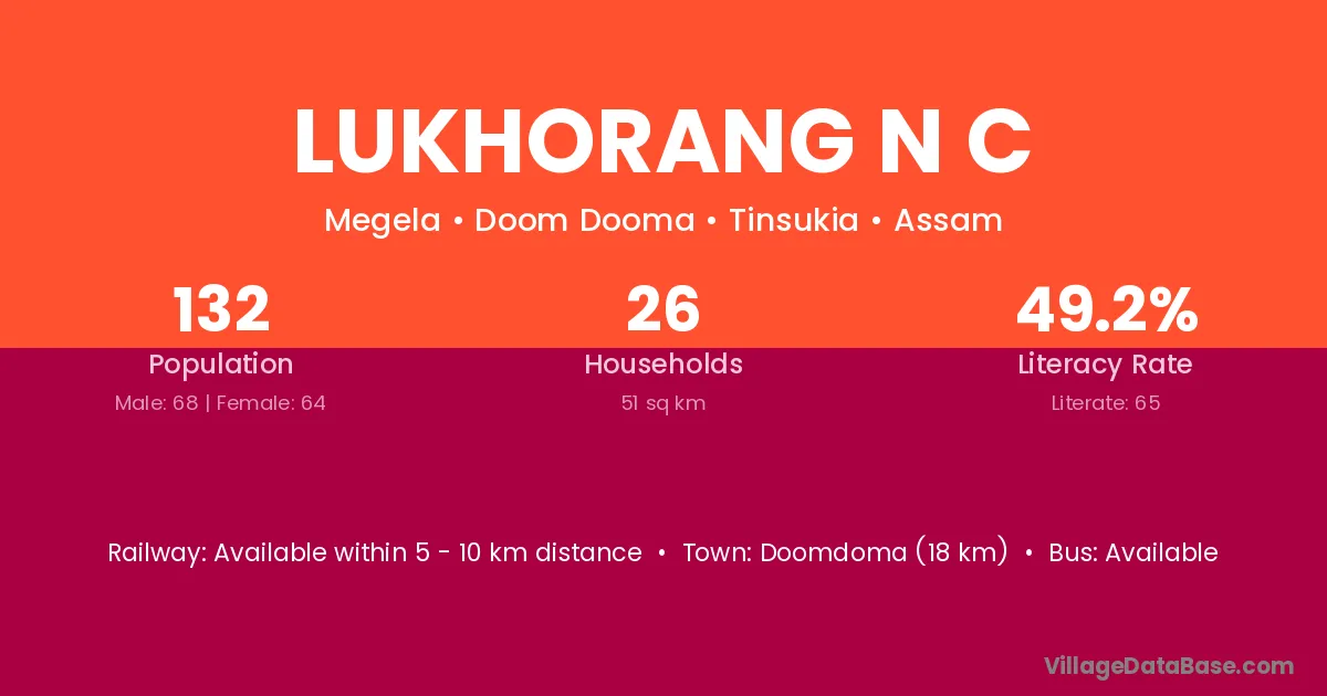Lukhorang N C village has a total population of 132 people, of which 68 are males and 64 are females.