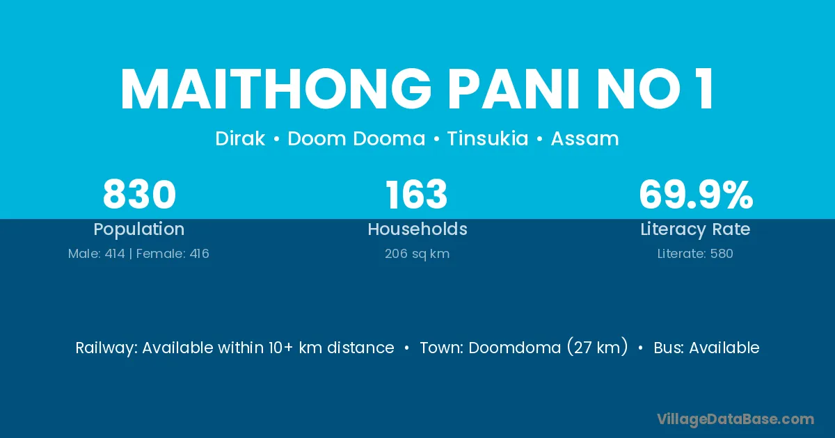 Doomdoma (27 km) is the nearest town to Maithong Pani No 1 village for major economic activities and is located approximately 27 km away.