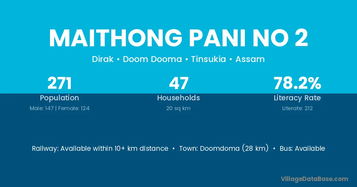 Doomdoma (28 km) is the nearest town to Maithong Pani No 2 village for major economic activities and is located approximately 28 km away.