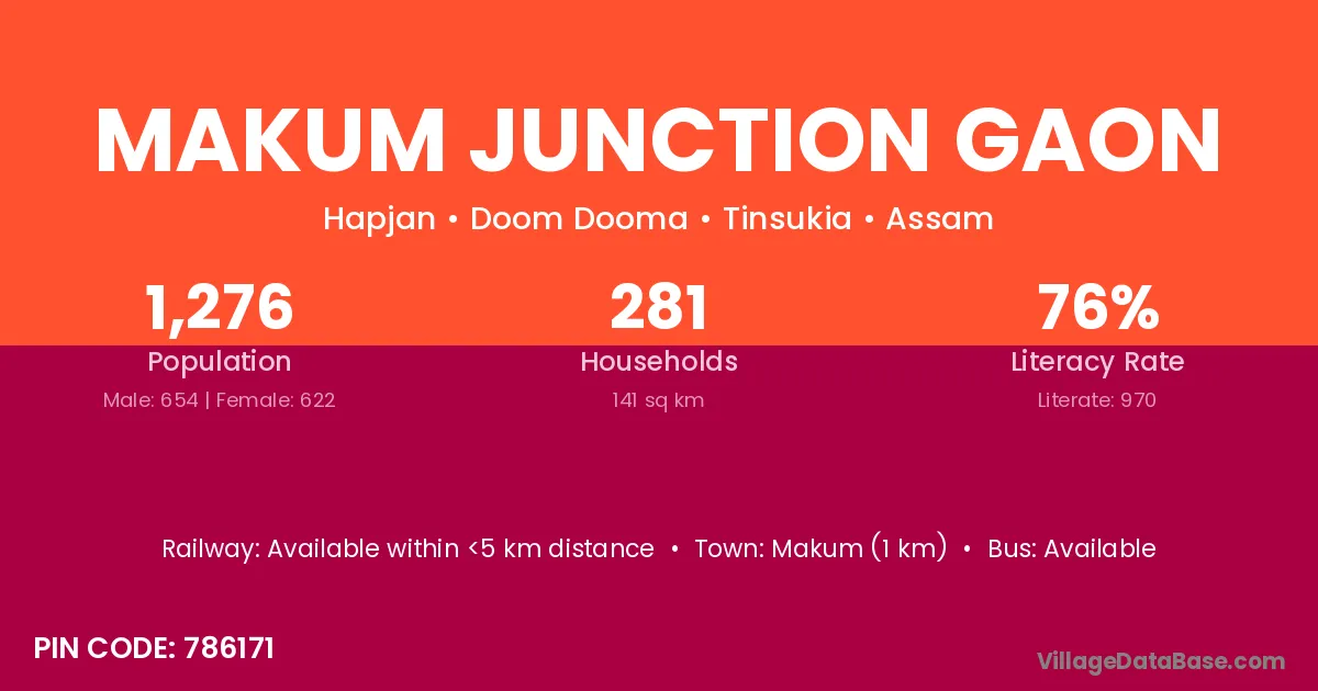 Makum (1 km) is the nearest town to Makum Junction Gaon village for major economic activities and is located approximately 1 km away.