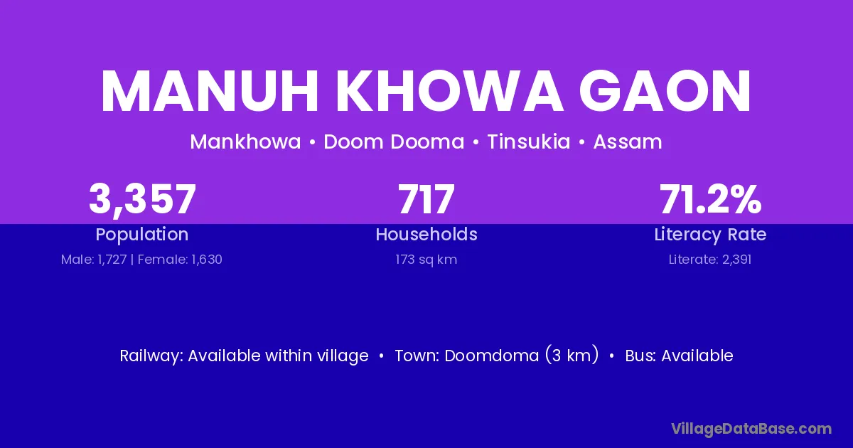 Manuh Khowa Gaon village has a total population of 3,357 people, of which 1,727 are males and 1,630 are females.