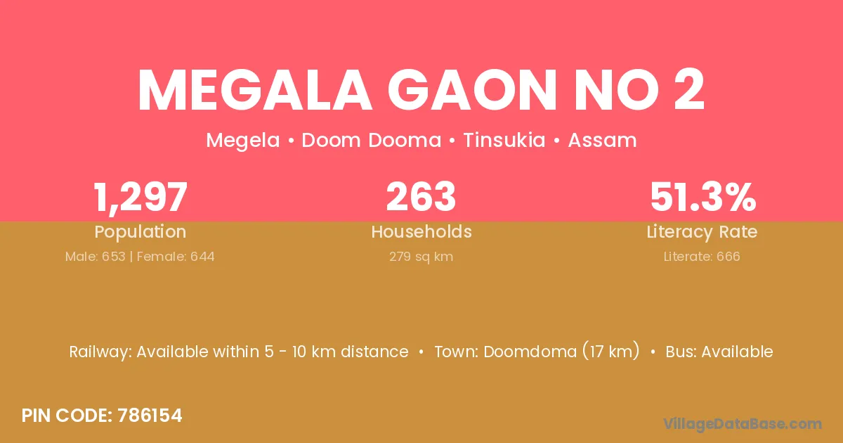Megala Gaon No 2 village has a total population of 1,297 people, of which 653 are males and 644 are females.