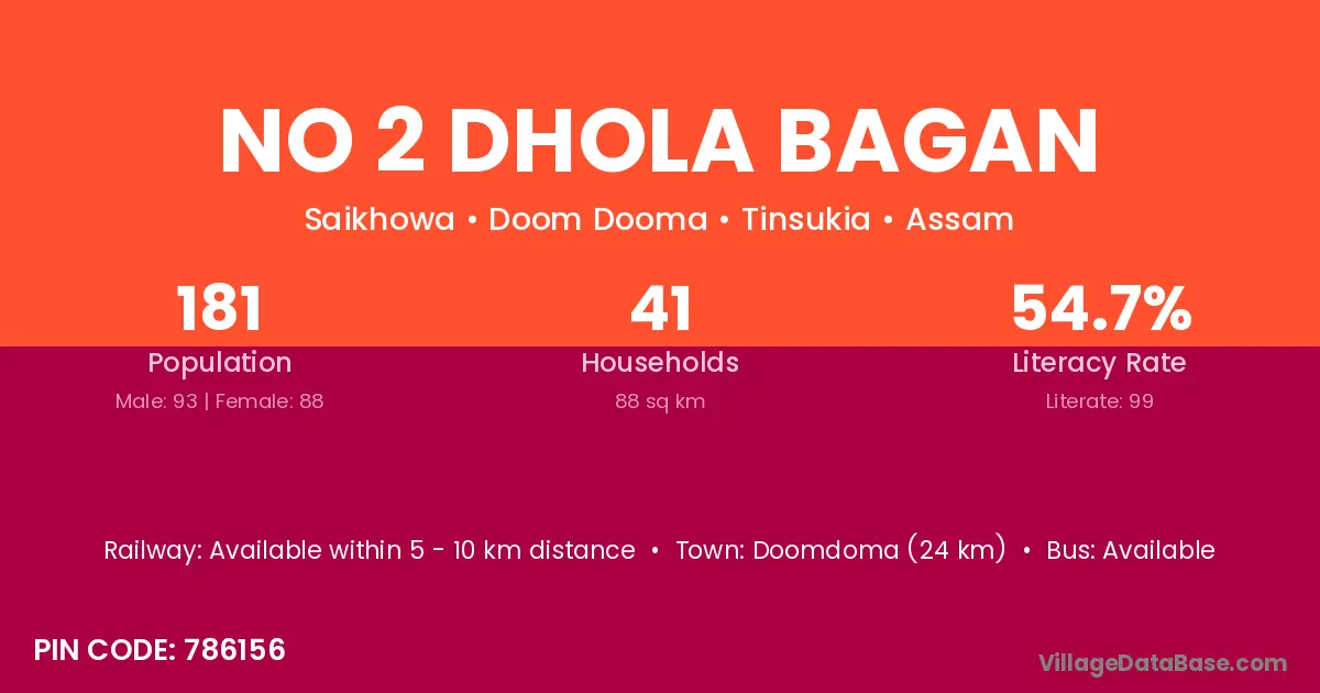 Doomdoma (24 km) is the nearest town to No 2 Dhola Bagan village for major economic activities and is located approximately 24 km away.