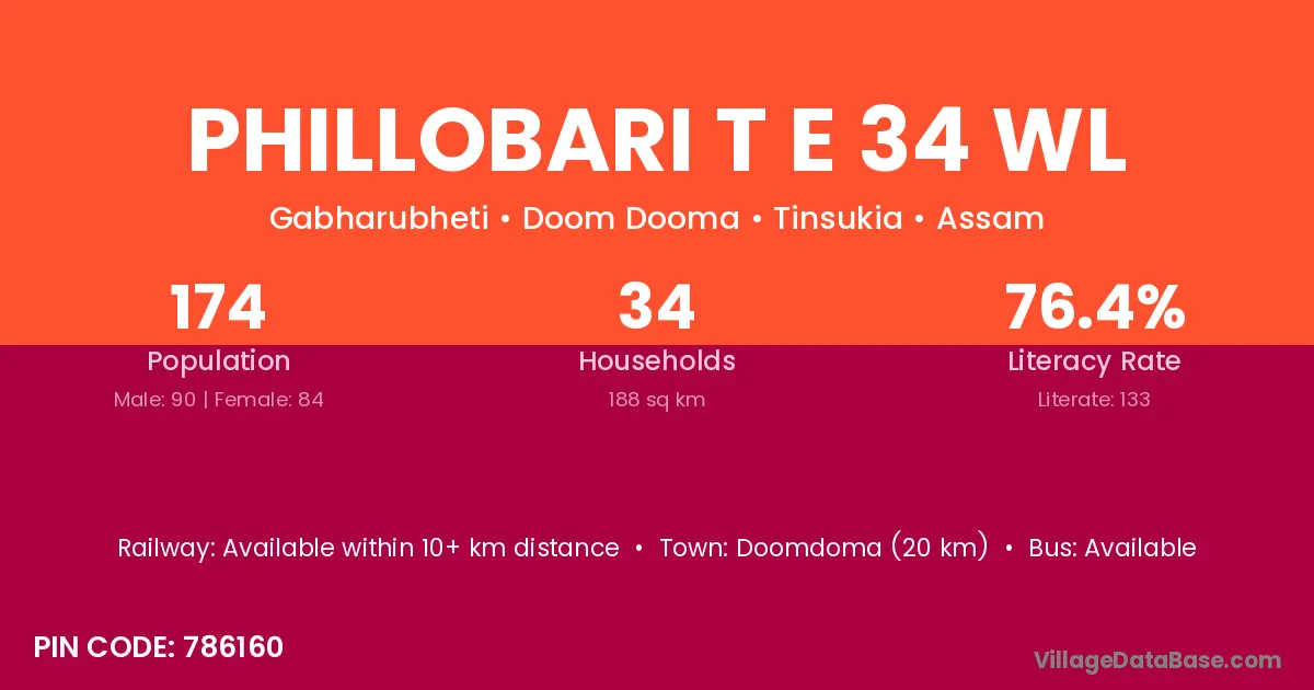 Doomdoma (20 km) is the nearest town to Phillobari T E 34 Wl village for major economic activities and is located approximately 20 km away.