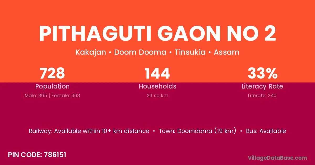 Pithaguti Gaon No 2 village has a total population of 728 people, of which 365 are males and 363 are females.