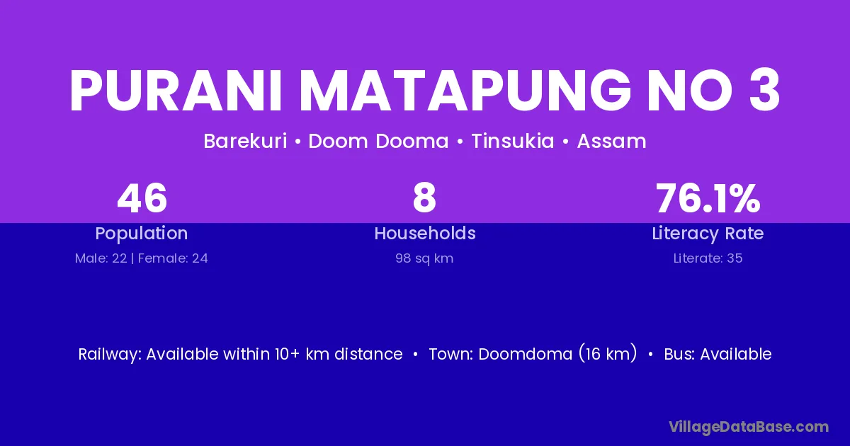Doomdoma (16 km) is the nearest town to Purani Matapung No 3 village for major economic activities and is located approximately 16 km away.