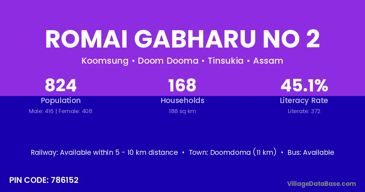 Doomdoma (11 km) is the nearest town to Romai Gabharu No 2 village for major economic activities and is located approximately 11 km away.