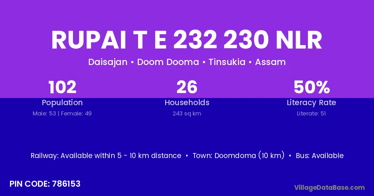 According to Census 2011 information, the village code of Rupai T E 232 230 Nlr village is 786153.