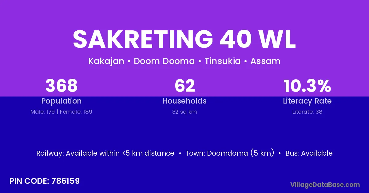 The literacy rate of Sakreting 40 Wl village is 10.33%. Male literacy stands at 16.20% and female literacy at 4.76%.