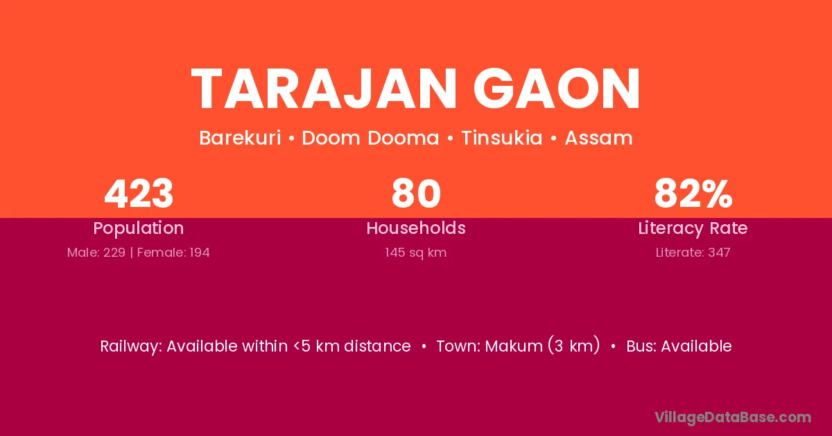 Makum (3 km) is the nearest town to Tarajan Gaon village for major economic activities and is located approximately 3 km away.