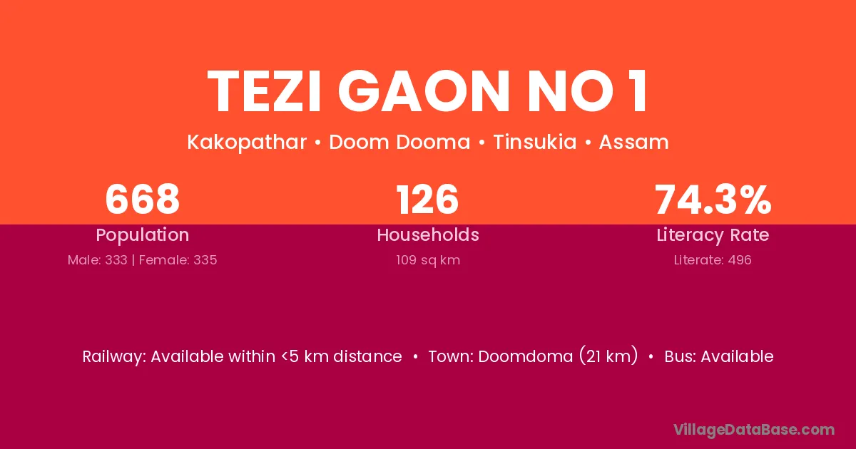 Tezi Gaon No 1 village has a total population of 668 people, of which 333 are males and 335 are females.