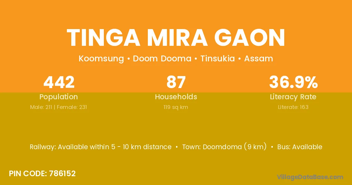 Tinga Mira Gaon village has a total population of 442 people, of which 211 are males and 231 are females.