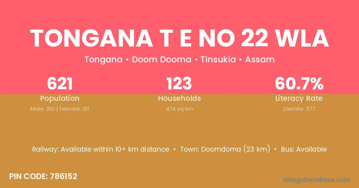 Tongana T E No 22 Wla village has a total population of 621 people, of which 310 are males and 311 are females.
