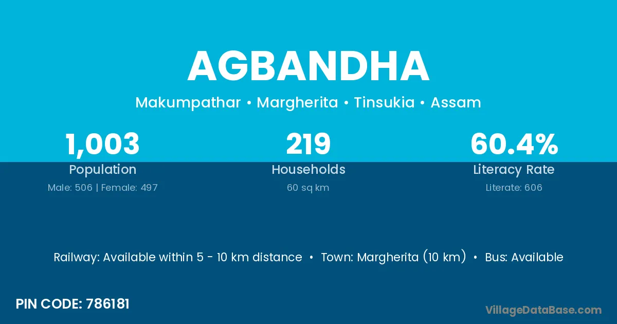 Margherita (10 km) is the nearest town to Agbandha village for major economic activities and is located approximately 10 km away.