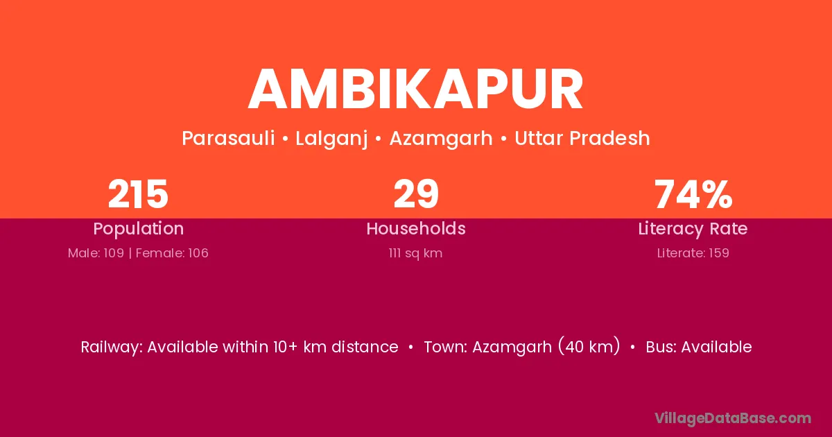 The literacy rate of Ambikapur village is 42.94%. Male literacy stands at 47.09% and female literacy at 38.44%.
