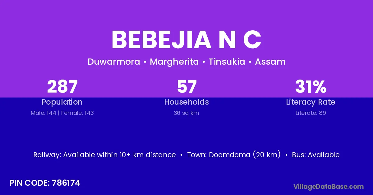 Bebejia N C village has a total population of 287 people, of which 144 are males and 143 are females.