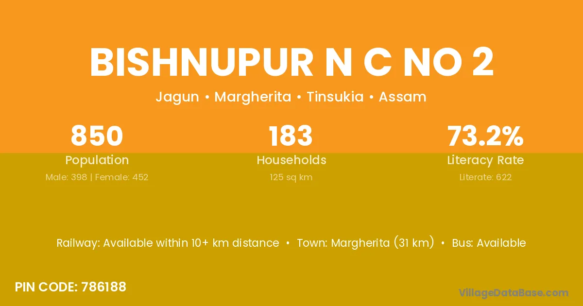 Margherita (31 km) is the nearest town to Bishnupur N C No 2 village for major economic activities and is located approximately 31 km away.