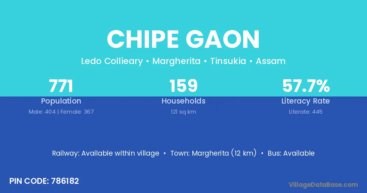 Margherita (12 km) is the nearest town to Chipe Gaon village for major economic activities and is located approximately 12 km away.
