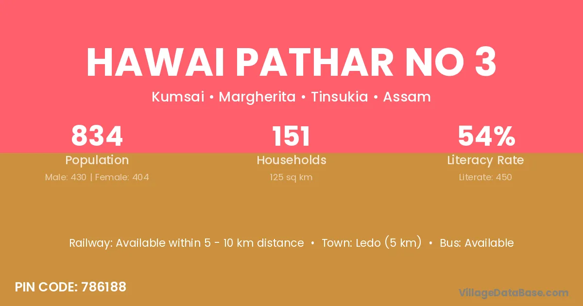 Ledo (5 km) is the nearest town to Hawai Pathar No 3 village for major economic activities and is located approximately 5 km away.
