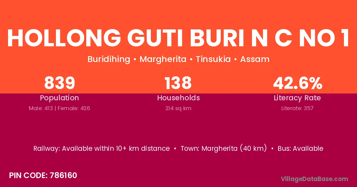 Margherita (40 km) is the nearest town to Hollong Guti Buri N C No 1 village for major economic activities and is located approximately 40 km away.