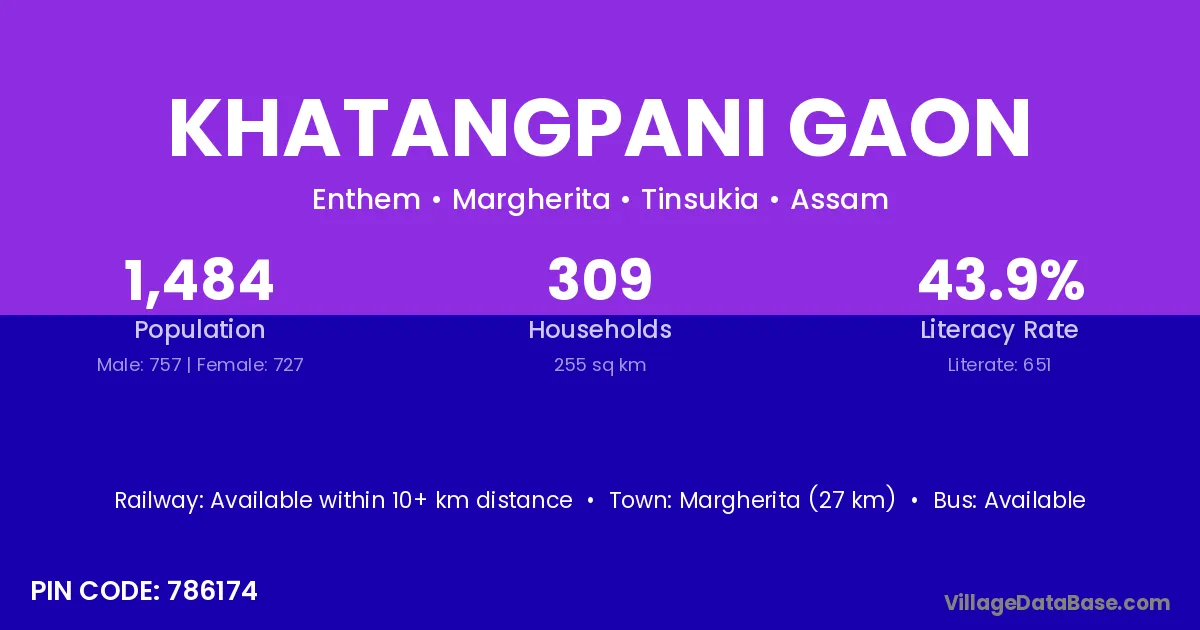 Margherita (27 km) is the nearest town to Khatangpani Gaon village for major economic activities and is located approximately 27 km away.