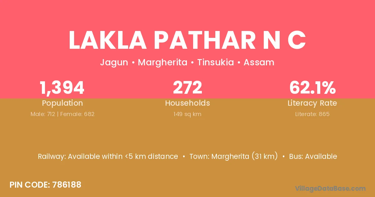 Margherita (31 km) is the nearest town to Lakla Pathar N C village for major economic activities and is located approximately 31 km away.