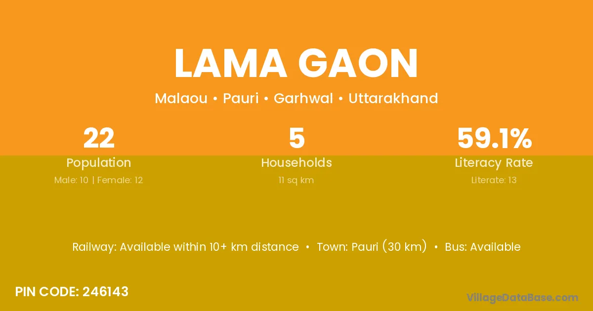 The literacy rate of Lama Gaon village is 56.78%. Male literacy stands at 63.89% and female literacy at 49.43%.