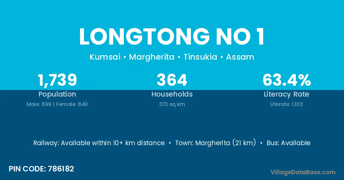 Margherita (21 km) is the nearest town to Longtong No 1 village for major economic activities and is located approximately 21 km away.