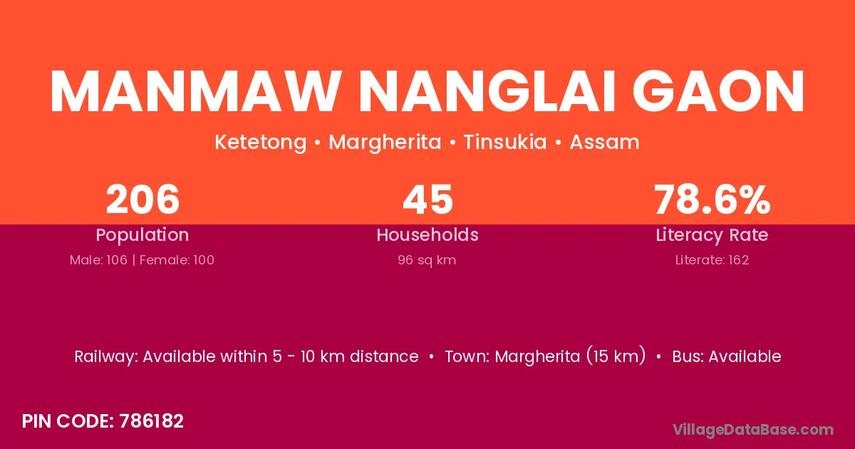 Margherita (15 km) is the nearest town to Manmaw Nanglai Gaon village for major economic activities and is located approximately 15 km away.