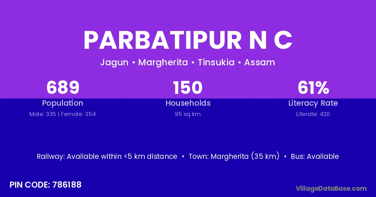 Margherita (35 km) is the nearest town to Parbatipur N C village for major economic activities and is located approximately 35 km away.