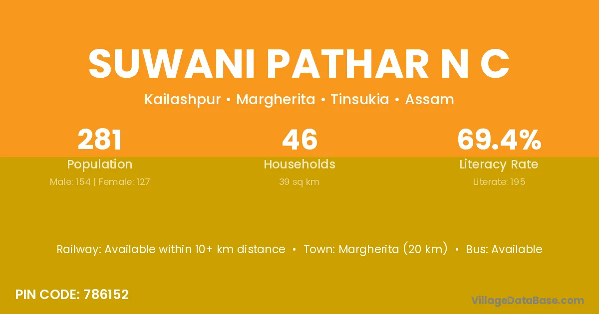 Margherita (20 km) is the nearest town to Suwani Pathar N C village for major economic activities and is located approximately 20 km away.