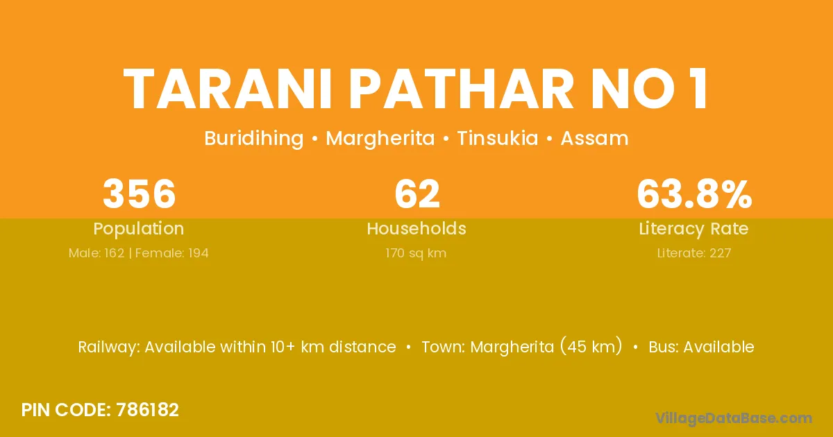 Margherita (45 km) is the nearest town to Tarani Pathar No 1 village for major economic activities and is located approximately 45 km away.