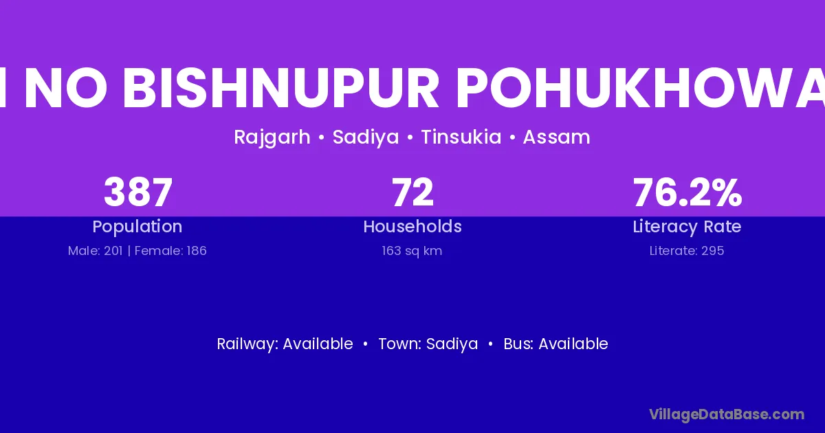 1 No Bishnupur Pohukhowa village has a total population of 387 people, of which 201 are males and 186 are females.