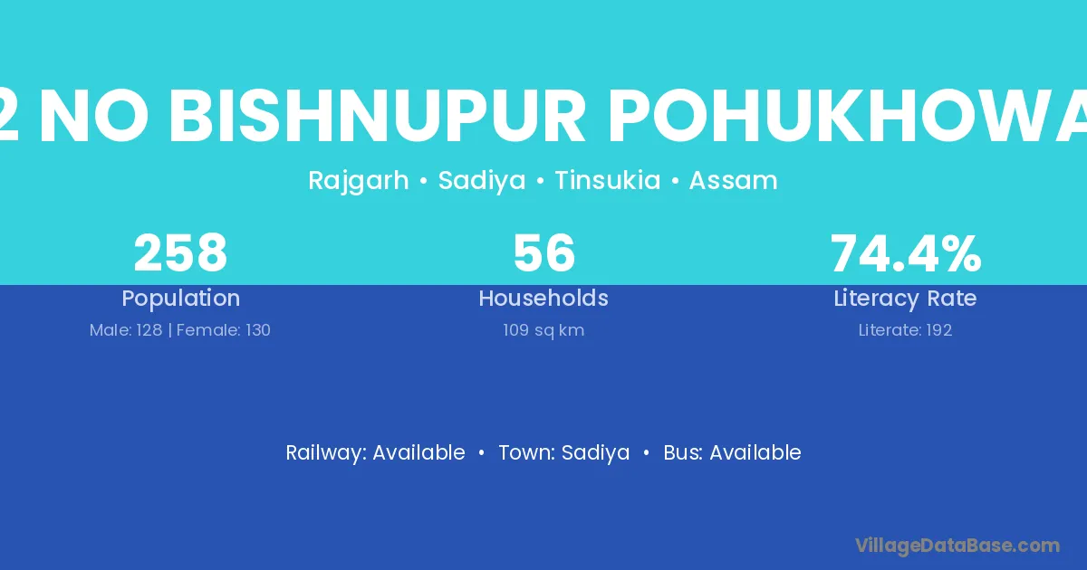 2 No Bishnupur Pohukhowa village has a total population of 258 people, of which 128 are males and 130 are females.