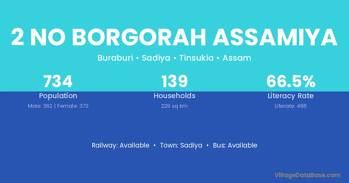 2 No Borgorah Assamiya village has a total population of 734 people, of which 362 are males and 372 are females.