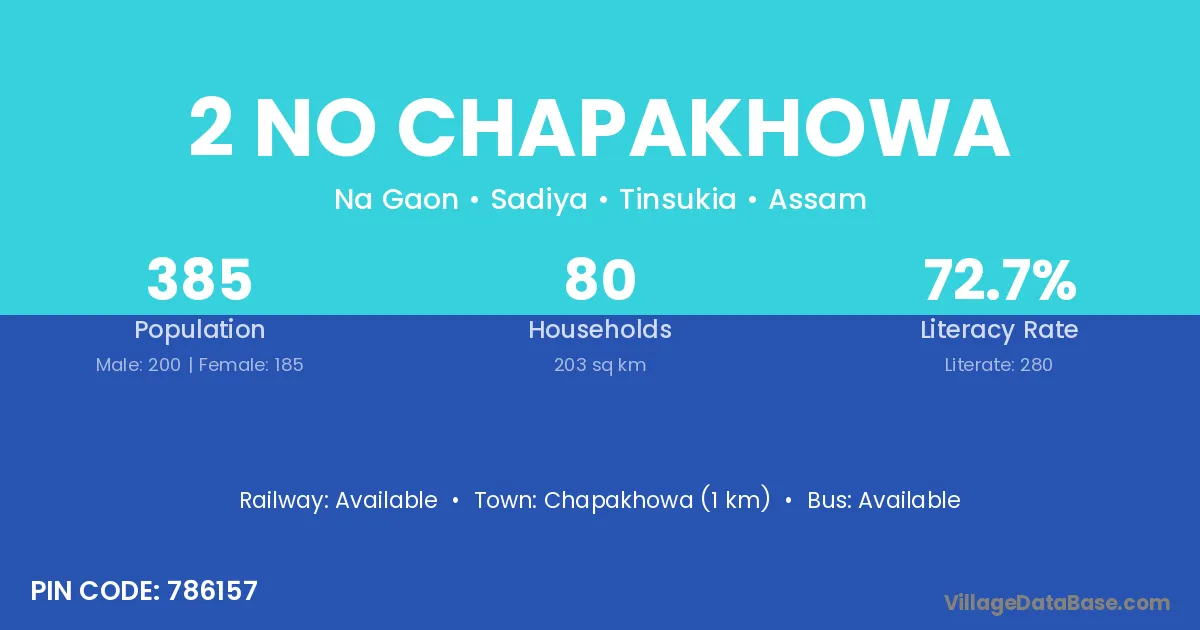 2 No Chapakhowa village has a total population of 385 people, of which 200 are males and 185 are females.