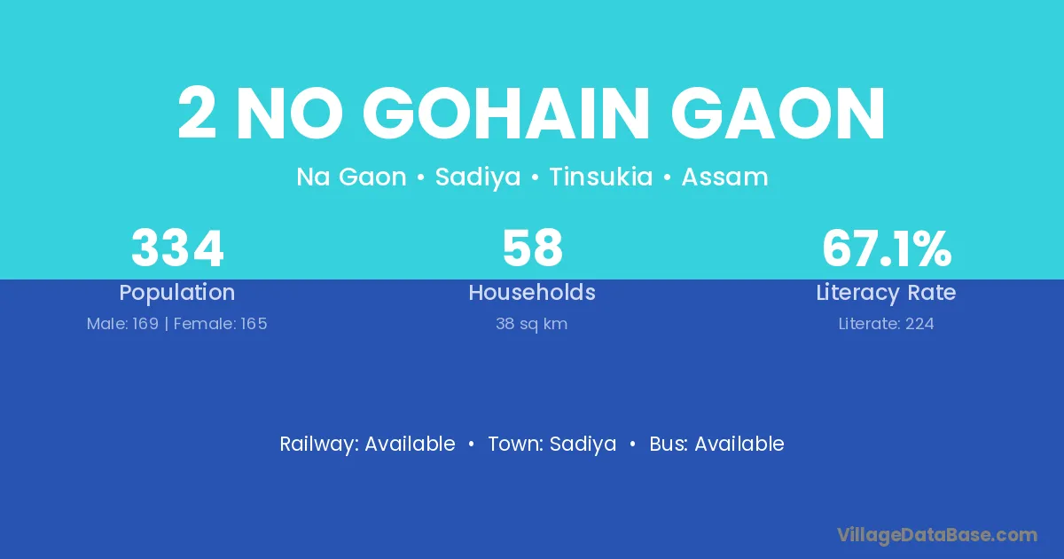 2 No Gohain Gaon village has a total population of 334 people, of which 169 are males and 165 are females.