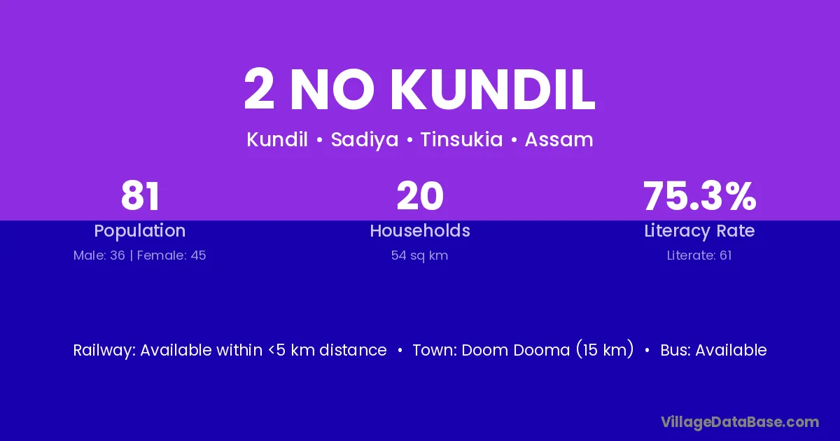 Doom Dooma (15 km) is the nearest town to 2 No Kundil village for major economic activities and is located approximately 15 km away.