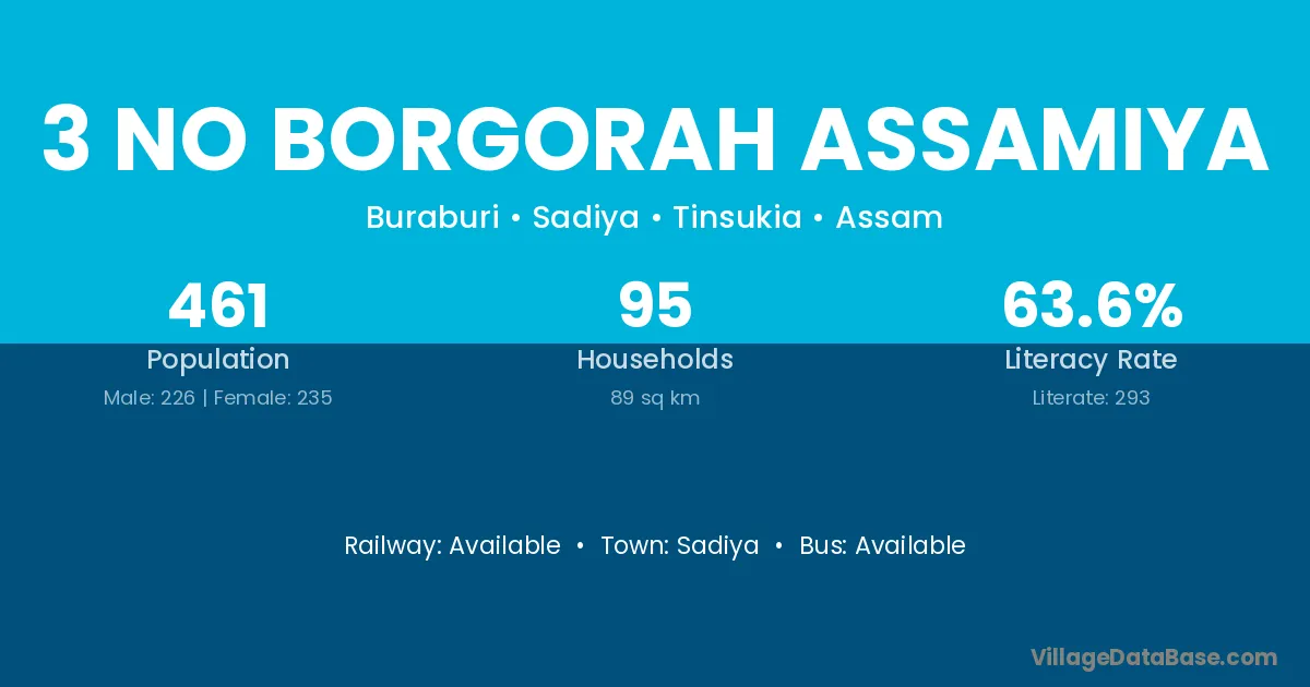 3 No Borgorah Assamiya village has a total population of 461 people, of which 226 are males and 235 are females.