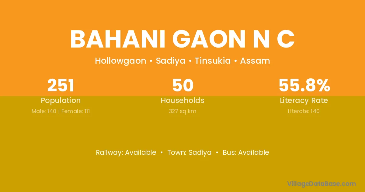 Bahani Gaon N C village has a total population of 251 people, of which 140 are males and 111 are females.