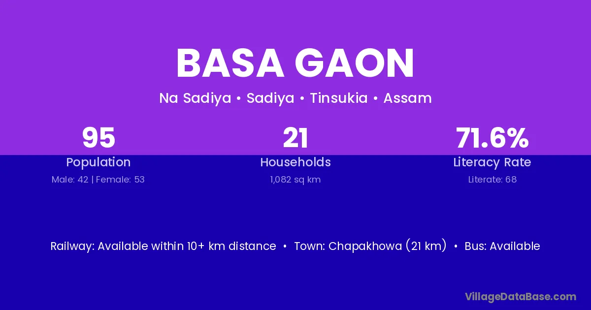 Chapakhowa (21 km) is the nearest town to Basa Gaon village for major economic activities and is located approximately 21 km away.