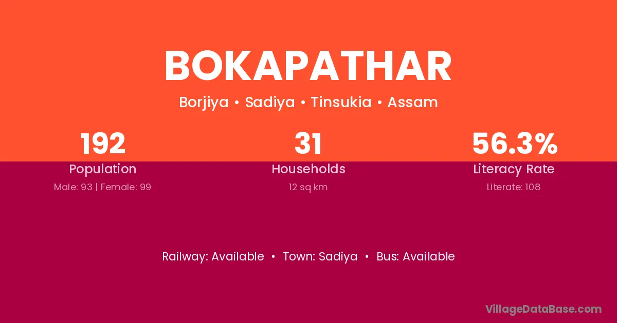 Bokapathar village has a total population of 192 people, of which 93 are males and 99 are females.