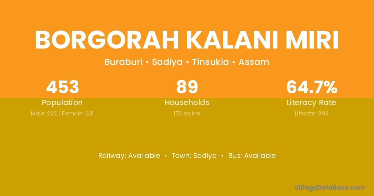 Borgorah Kalani Miri village has a total population of 453 people, of which 222 are males and 231 are females.