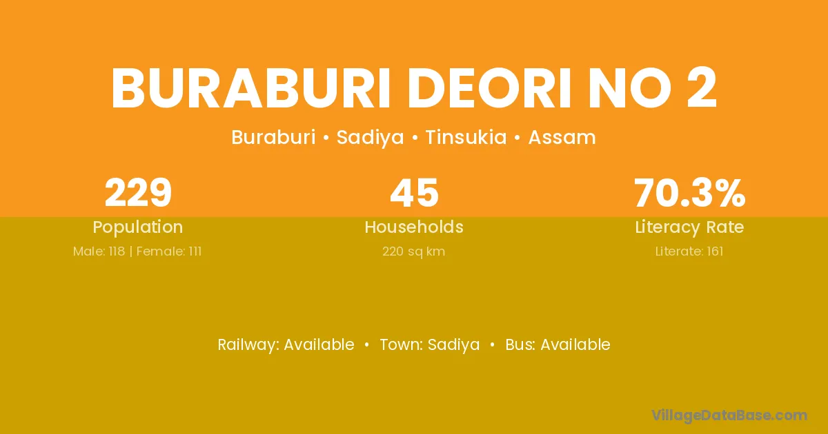 Buraburi Deori No 2 village has a total population of 229 people, of which 118 are males and 111 are females.