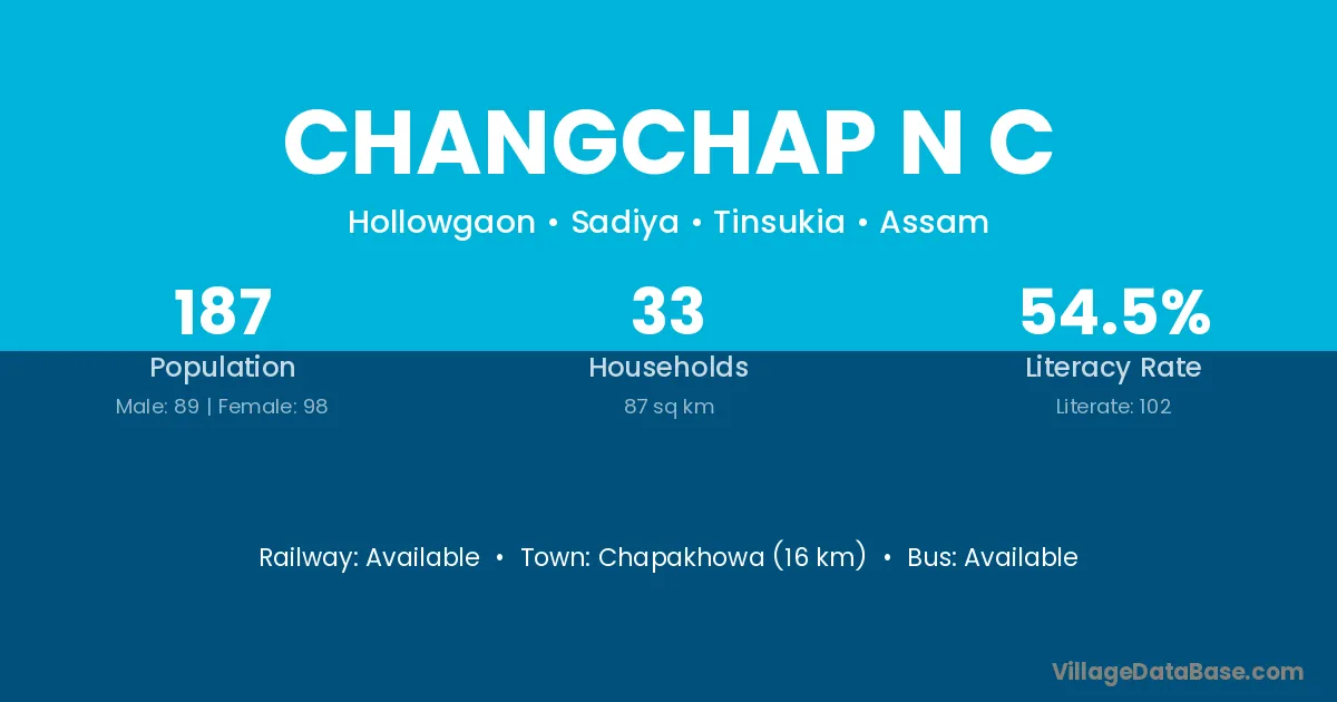 Chapakhowa (16 km) is the nearest town to Changchap N C village for major economic activities and is located approximately 16 km away.