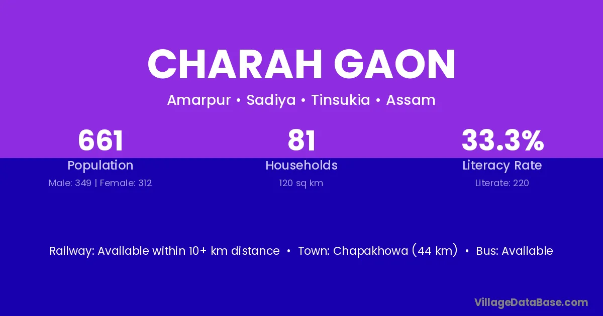 Chapakhowa (44 km) is the nearest town to Charah Gaon village for major economic activities and is located approximately 44 km away.