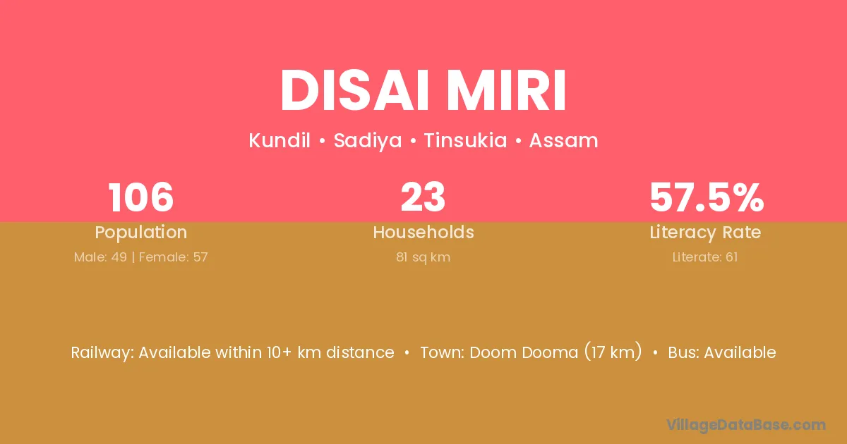 Disai Miri village has a total population of 106 people, of which 49 are males and 57 are females.