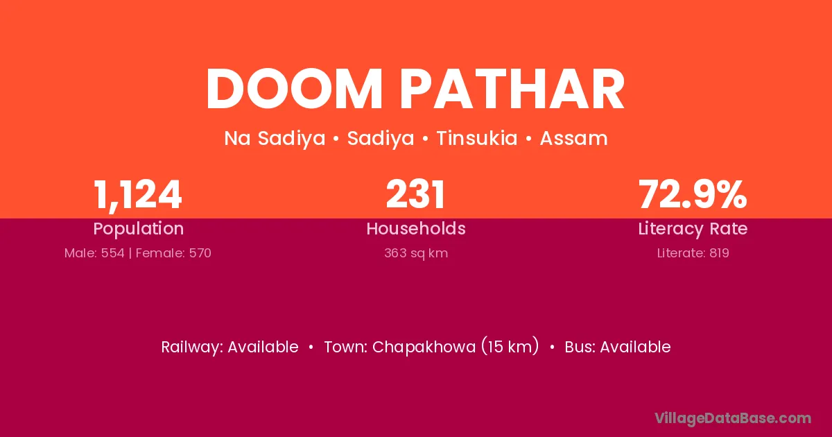 Chapakhowa (15 km) is the nearest town to Doom Pathar village for major economic activities and is located approximately 15 km away.