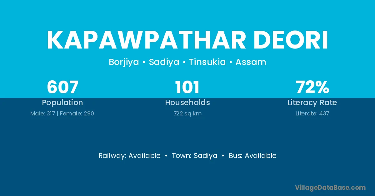 Kapawpathar Deori village has a total population of 607 people, of which 317 are males and 290 are females.